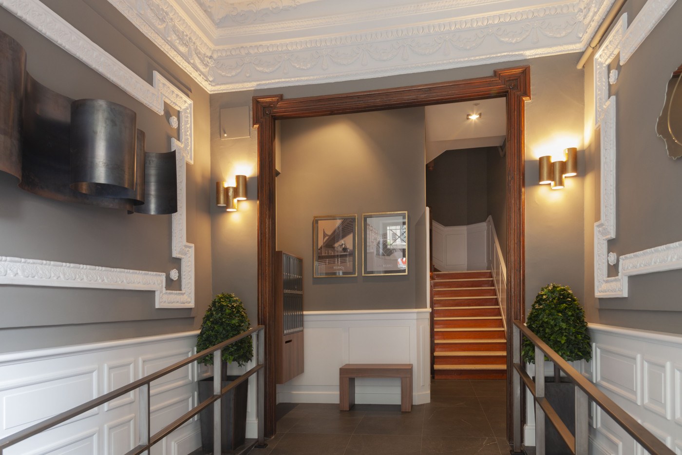 Elegimos un color para la pared y toda la escalera que contrastase con el blanco del zócalo alto y la madera oscura. El color seleccionado fue un topo, entre el gris y el marrón, realzando así la moldura clásica y aportando elegancia.