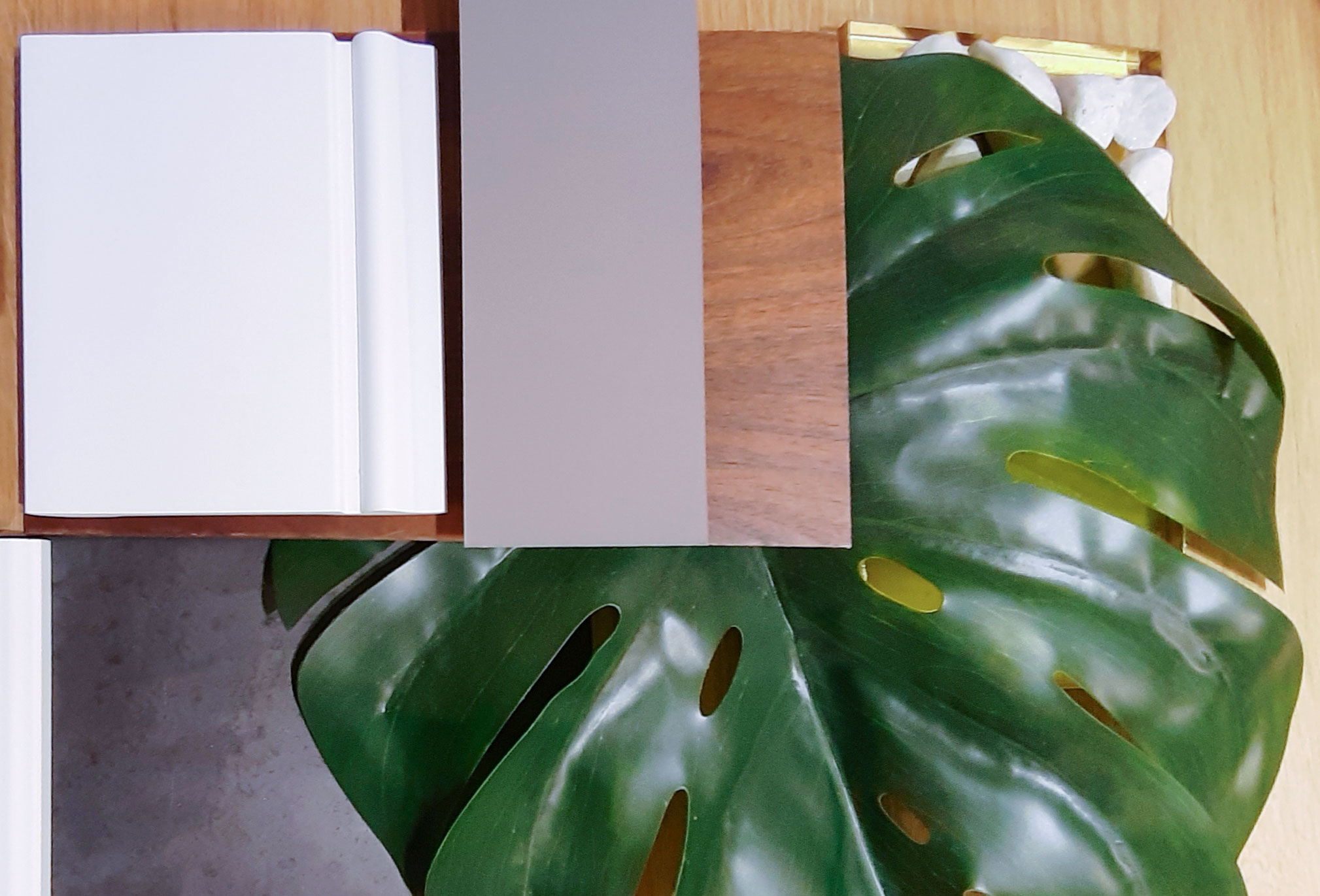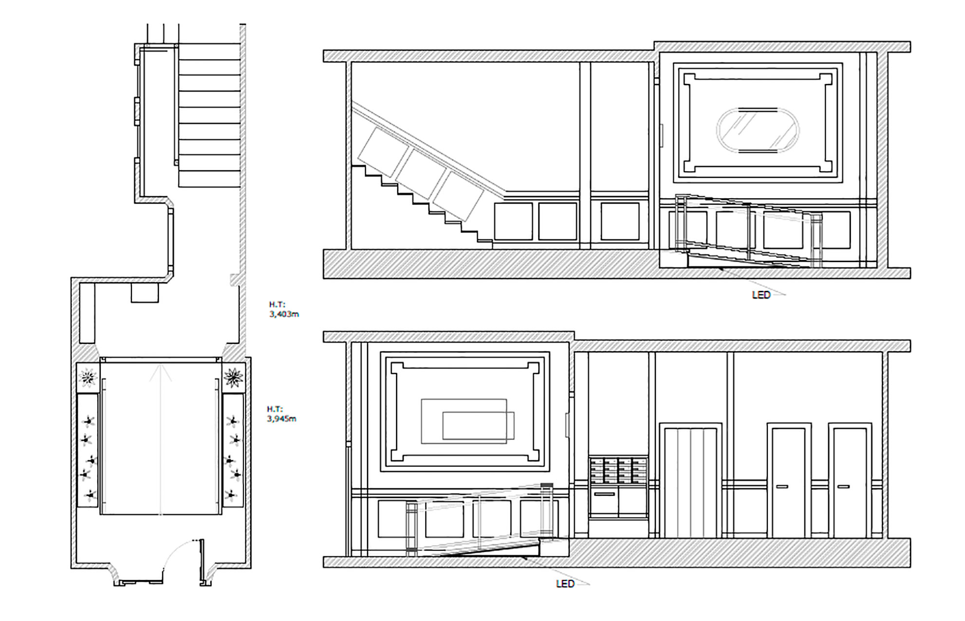 Para las paredes laterales del primer tramo del portal, donde se sitúa la rampa, optamos por una solución que sirviera para iluminar el espacio y decorarlo: en una pared realizamos una escultura icónica de Zaila retro-iluminada realizada en chapas de hierro natural y frente a ella un espejo con formas clásicas, también iluminado, creando un espacio único. Acompañamos la iluminación de día con unos apliques en color oro y por la noche, decidimos marcar la rampa con unas tiras de led a ambos lados proyectando la luz hacia unos centros de vegetación inerte con piedras blancas y rocas. En los podios, también a ambos lados de la rampa, realizamos unas jardineras en hierro natural con unos pinos decorativos, dando el toque vegetal necesario.