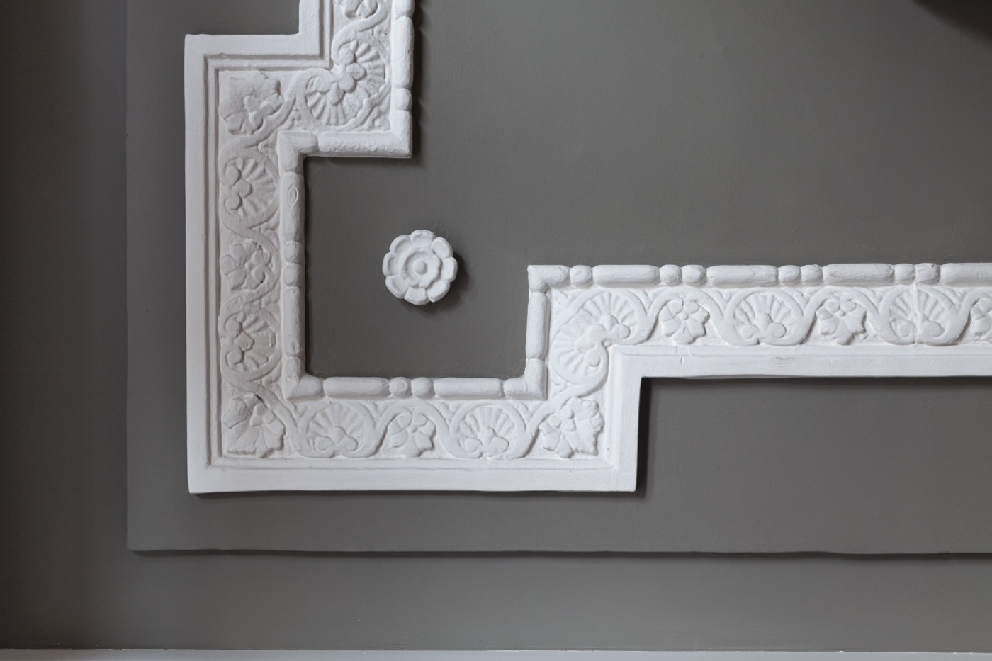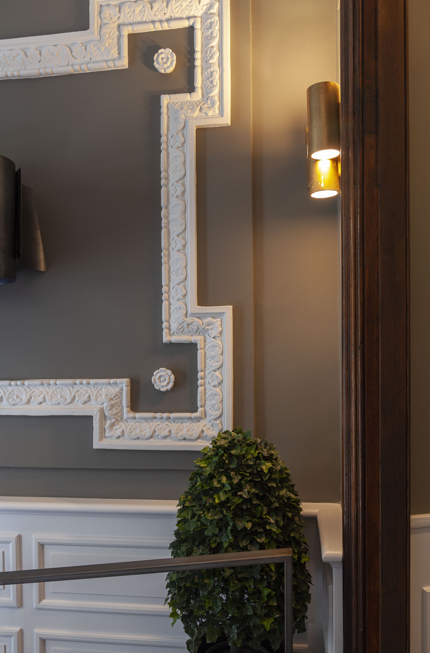 Elegimos un color para la pared y toda la escalera que contrastase con el blanco del zócalo alto y la madera oscura. El color seleccionado fue un topo, entre el gris y el marrón, realzando así la moldura clásica y aportando elegancia.